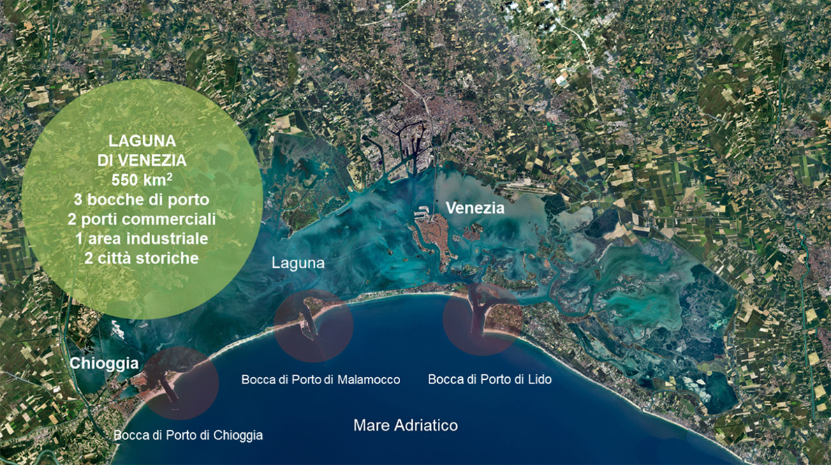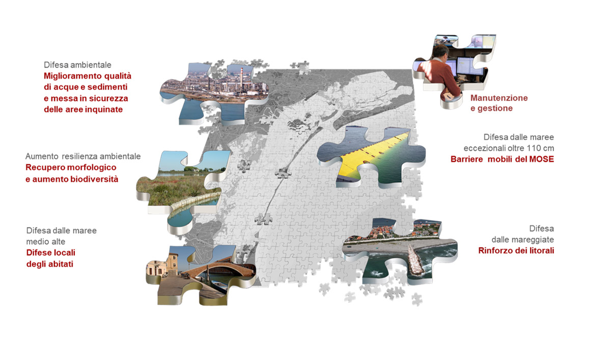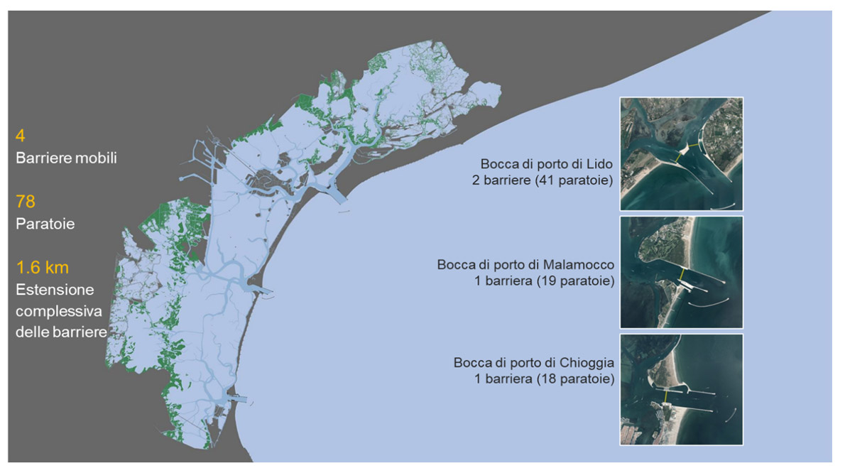 - Difesa dalle acque alte: MOSE – opere alle bocche di porto per la regolazione delle maree;
